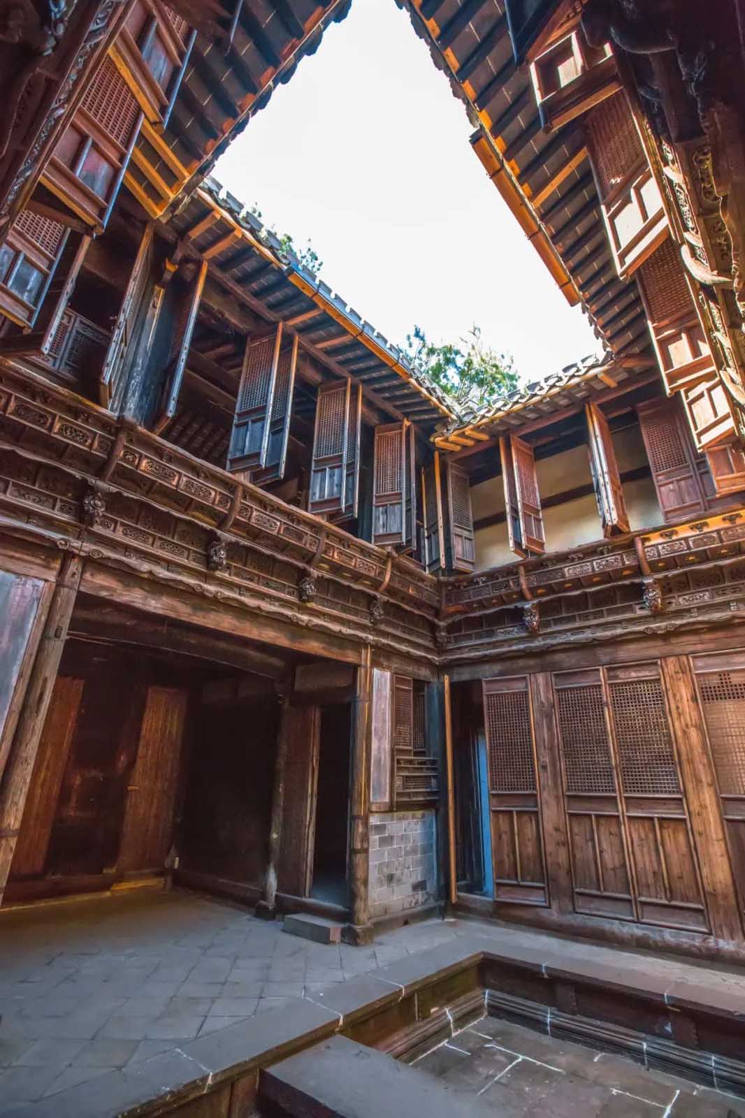 而臥室、廳堂等空間,又因襲四合院的布局,在建筑之中圍合出一方院落,干欄式建筑的“樓居”形式,讓其在視覺比例上,顯得幽深窄小,人們形象地稱之為:“天井”。