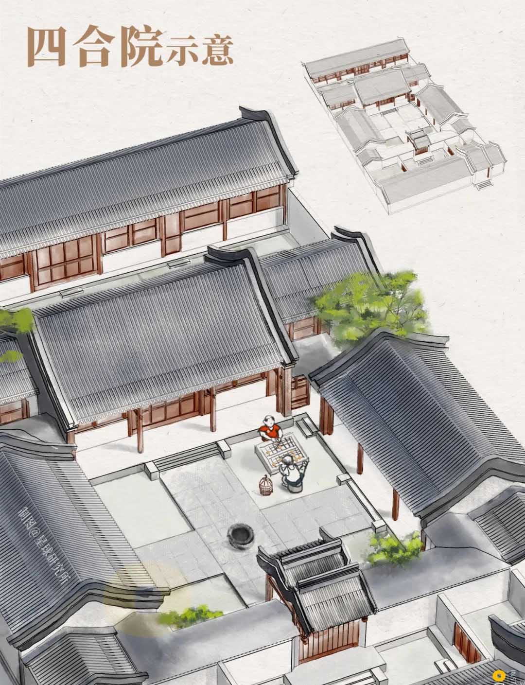 其次,是附著于結構之上的,建筑形式的融合,移民們參照當?shù)兀蓹谑浇ㄖ摹皹蔷印毙问?,將原本平鋪在地面上的,四合院建筑抬升?-3層,一般來說,一層中間布置廳堂。