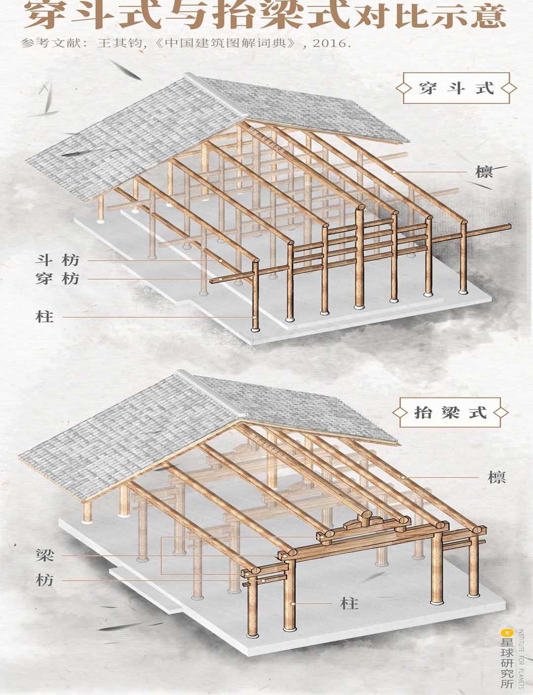 (穿斗式與抬梁式對比示意,檁條直接放置在柱子上,再用穿枋和斗枋連接為一個整體,是為穿斗式;柱上放梁,梁上架檁,柱子將梁層層抬起,是為抬梁式,制圖@王申雯/星球研究所)