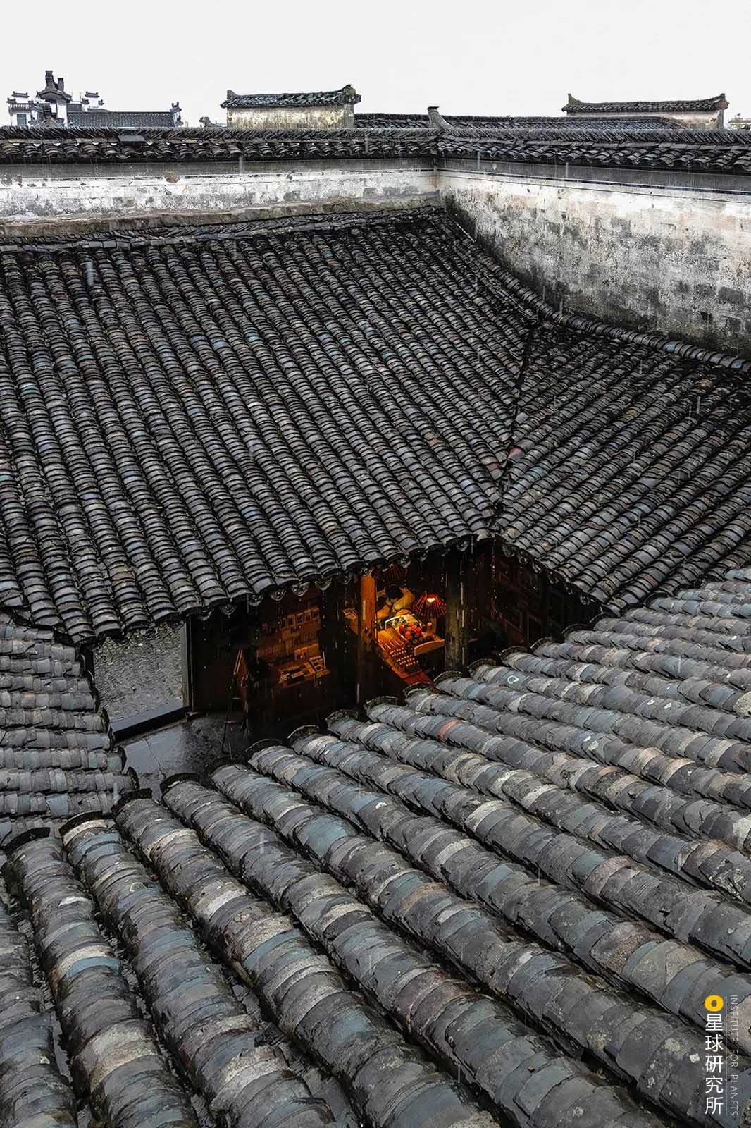 在雨天,雨水順著四周傾斜的屋頂,匯入天井,是為“四水歸堂”,寓意“肥水不流外人田”,不知從前是否有佳人,倚著美人靠,靜默聽雨。