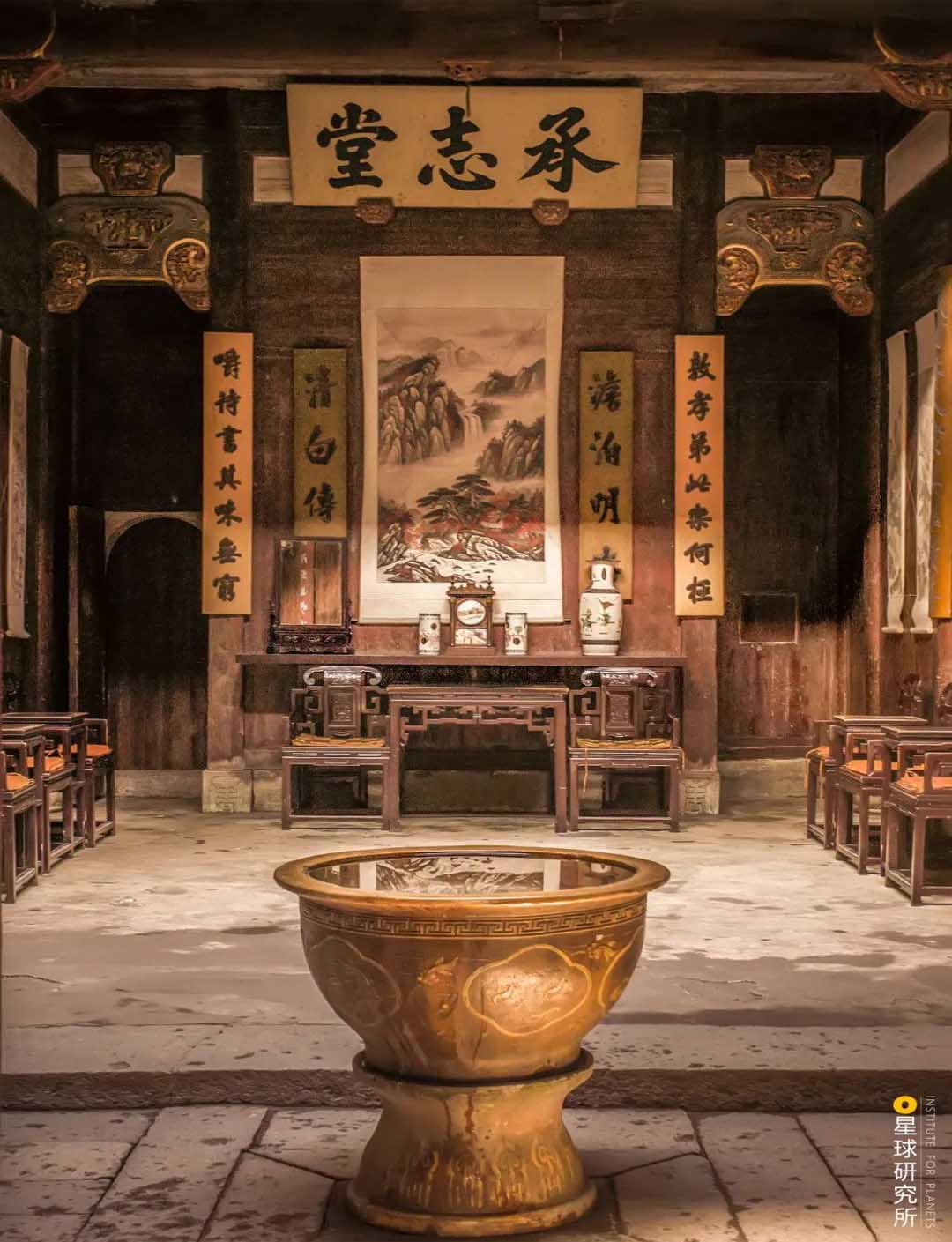 (宏村承志堂,徽州的廳堂一般題有堂名,掛有代表家訓的對聯(lián),正中供桌上的銅鏡用來正衣冠,鐘用來計時,瓶往往用來放主人的帽子,有帽子表示主人在家,最重要的是寓意終生平靜, 攝影師@阿呆)