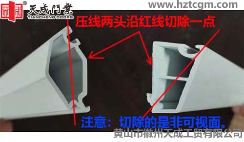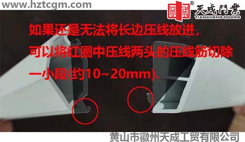 切除兩端內(nèi)側(cè)斜角后,有些壓線還是無(wú)法放入壓線槽,我們可以再將壓線兩端的壓線筋切除一小部分(兩端各10-20mm),就可以輕松將小片玻璃的長(zhǎng)邊壓線放進(jìn)玻璃壓線槽了。